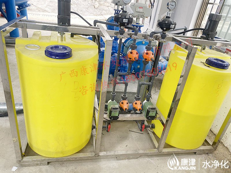 工藝流程:河水-原水箱-絮凝加藥-石英砂過濾器(二級過濾)-二氧化氯消毒-凈水箱
